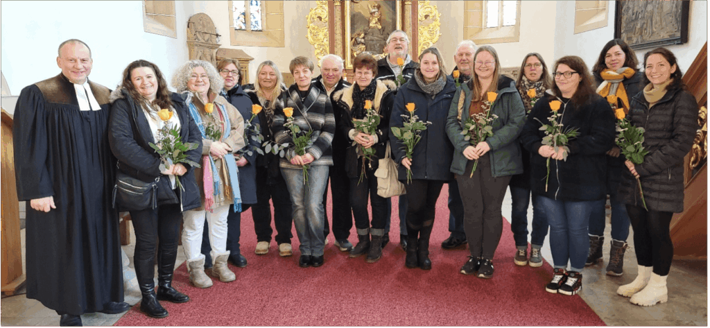 Von links: Pfarrer Stefan Lipfert, Sandra Zimmermann, Eva Maria Zeller, Monika Dupke, Barbara Täuber, Elena Fasilov, Günther Pfändner, Swetlana Frank, Gisbert Kaluz, Lea Ziebis, Stefan Nitschke, Franziska Schleicher, Anita Wiesenmüller, Jana Voll, Melanie Schoberth, Julia Klaus.